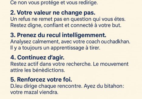 « Le refus dans les chidoukhim : une étape, pas un échec » Dans le parcours du chidoukh, chaque candidat rêve de rencontrer la bonne personne, celle avec qui il construira un foyer juif solide sous la houppa. Mais il arrive que certaines propositions soient refusées, parfois sans explication claire. Ces refus, bien que douloureux sur le…